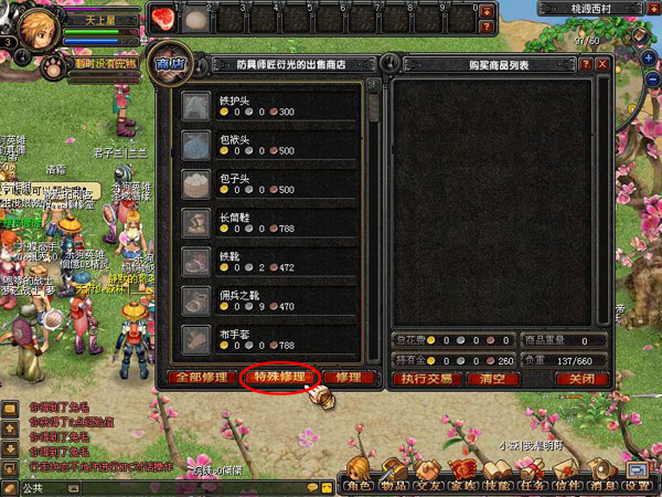 全部修理:修理身上正在穿着所有的装备。只要点击一次[全部修理]按钮并在讯问是否确定修理时点击确定即可。注意装备每修理一次,最大耐久度就会下降一点。 修理:点击[修理]按钮后鼠标会变成修理的图标,这时候只要点击自己想要修理的物品,就会看见修理需要的花费,点击确定后修理完成。注意装备每修理一次,最大耐久度就会下降一点。 特殊修理:点击[特殊修理]按钮后鼠标会变成修理的图标,这时候只要点击自己想要修理的物品,就会看见修理需要的花费,点击确定后修理完成。特殊修理三次,最大耐久度才会下降一点,但是需要的资金会比普通修理稍贵一些。